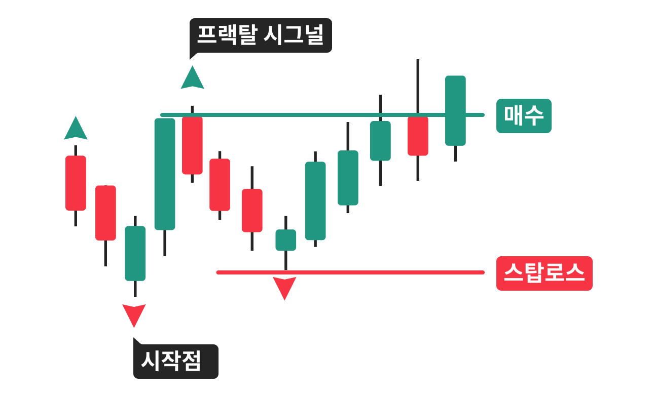 매수 프랙탈 → 가격이 이전의 매수 프랙탈(아래 화살표) 위로 올라설 때