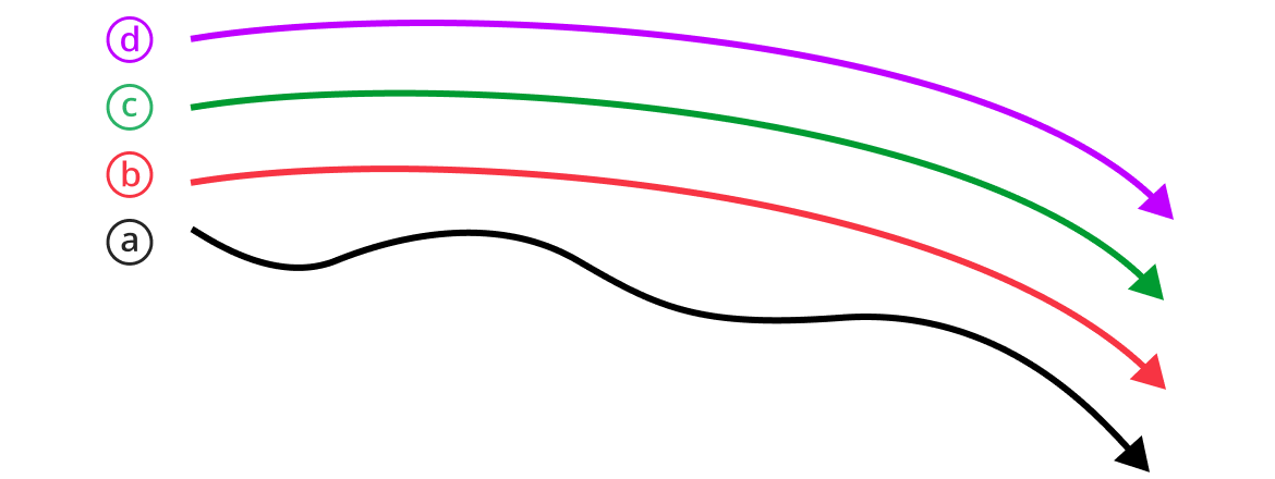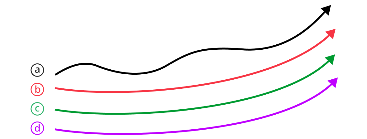 ⓓ장기 > ⓒ중기 > ⓑ단기 > ⓐ주가(가격) 이평선의 순서로 배열된 상태